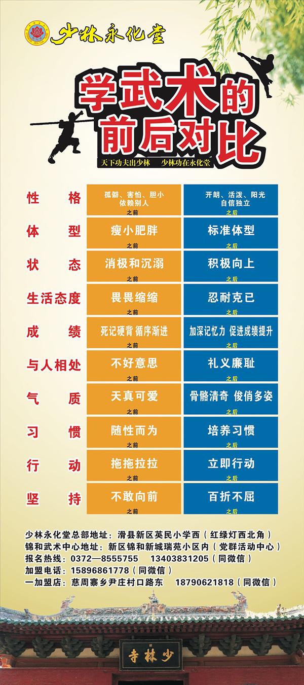 备注:孤儿持村委或小区证明,学费全免,单亲家庭持证明学费减半,成绩优异者学费减免或保送嵩山少林寺武僧团及各大体院